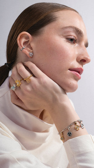Valinta riippuu tyylistä ja käyttötarkoituksesta. Hopeinen sormus on raikas ja monikäyttöinen arjen valinta, kun taas kultasormus tuo lämpöä ja hienostuneisuutta ilmeeseen. Pronssinen sormus puolestaan tuo lämmintä ja pehmeää sävyä, kun taas kullattu hopea yhdistää kultaisen sävyn hopean kestävyyteen. Lumoavan sormuksissa käytetyt materiaalit on valittu kestämään aikaa ja säilyttämään ilmeensä.