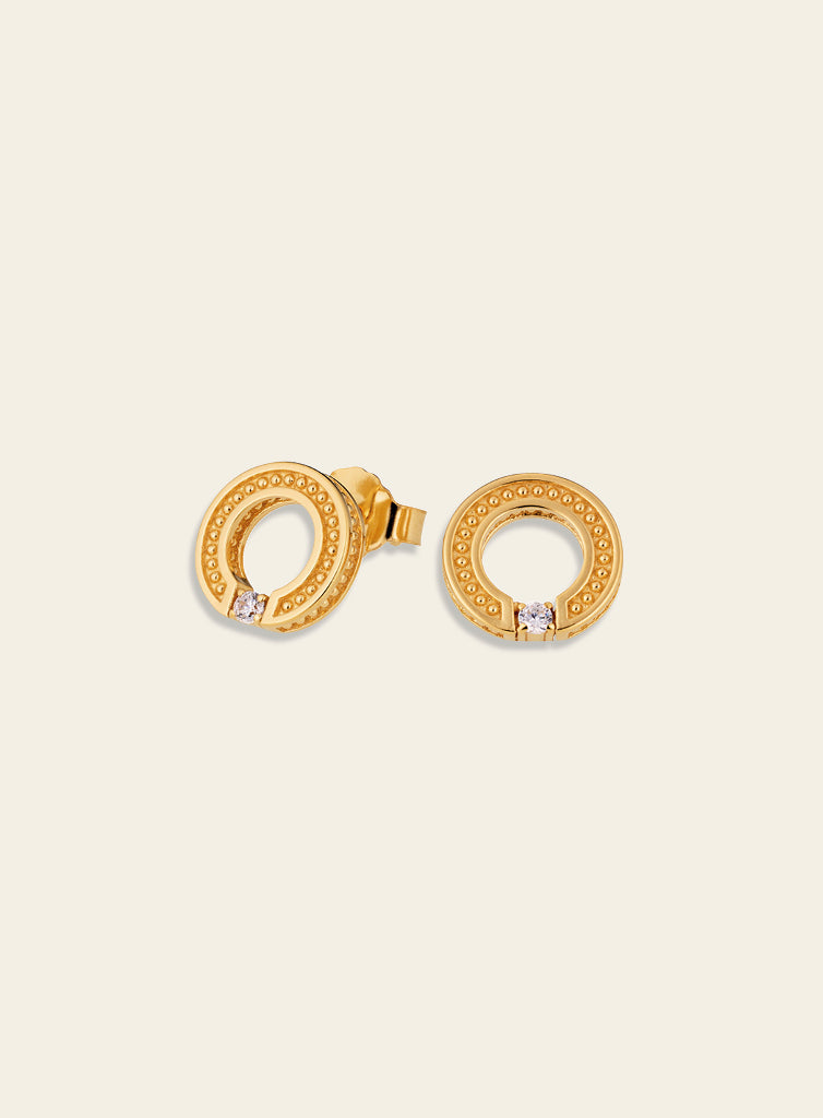 Aina-korvakorujen minimalistinen muoto on viimeistelty pienillä yksityiskohdilla – helmeilevällä reunalla ja kirkkaalla kivellä, joka antaa rauhalliseen muotoon tarkasti kohdennetun säihkeen. Tässä sarjassa yhdistyvät selkeys ja hienovaraisuus. Se ei ole sesonkiin sidottu vaan suunniteltu kestämään aikaa – sellainen koru, joka toimii aina, riippumatta tilanteesta tai tyylistä. Saatavilla myös hopeisena. Korun koko on 11mm.