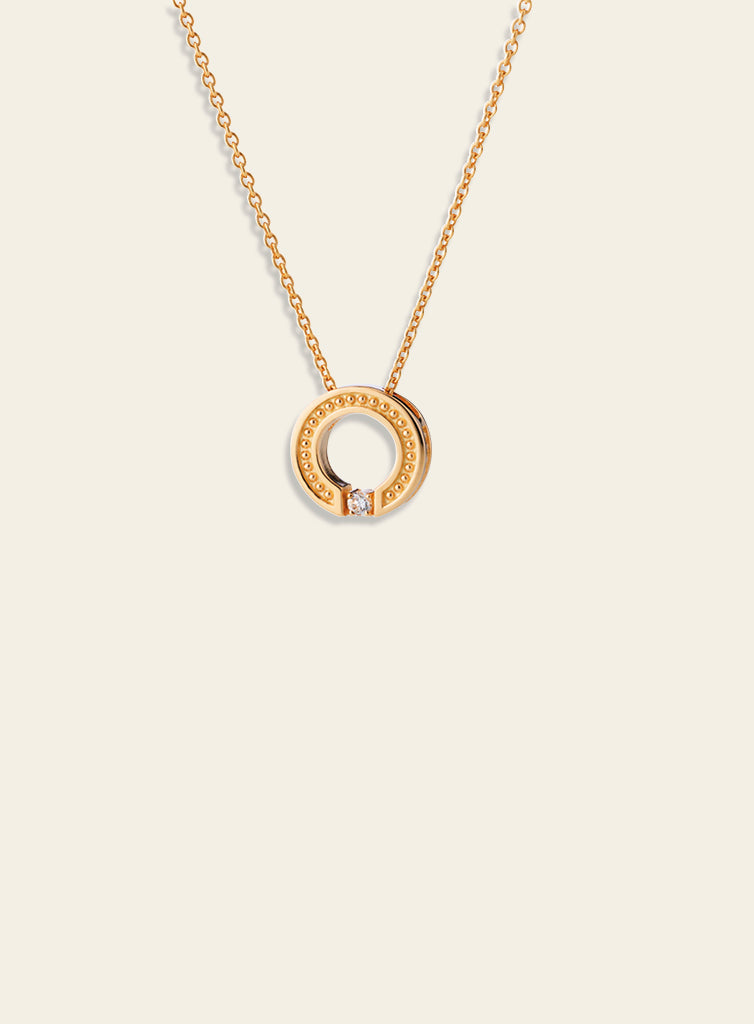 Aina- riipuksen selkeä muoto yhdistyy helmeilevään reunukseen ja laadukkaaseen w/vs laboratoriotimanttiin, joka antaa rauhalliseen muotoon tarkasti kohdennetun säihkeen. Tässä sarjassa yhdistyvät selkeys ja hienovaraisuus. Se ei ole sesonkiin sidottu vaan suunniteltu kestämään aikaa – sellainen koru, joka toimii aina, riippumatta tilanteesta tai tyylistä. Korun koko on 11mm ja timantin paino 0,03ct, riipusta saatavilla kahdella eri ketjun mitalla 45 cm tai 50 cm.