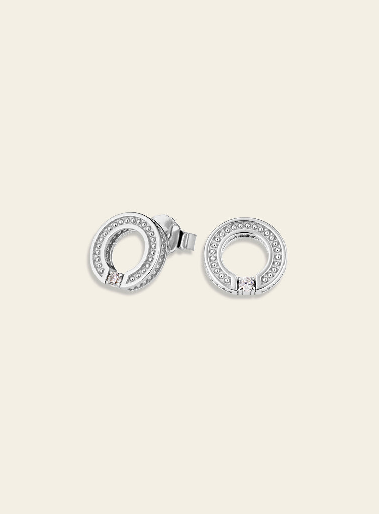 Aina-korvakorujen minimalistinen muoto on viimeistelty pienillä yksityiskohdilla – helmeilevällä reunalla ja kirkkaalla kivellä, joka antaa rauhalliseen muotoon tarkasti kohdennetun säihkeen. Tässä sarjassa yhdistyvät selkeys ja hienovaraisuus. Se ei ole sesonkiin sidottu vaan suunniteltu kestämään aikaa – sellainen koru, joka toimii aina, riippumatta tilanteesta tai tyylistä. Saatavilla myös keltakullattuna. Korun koko on 11mm.