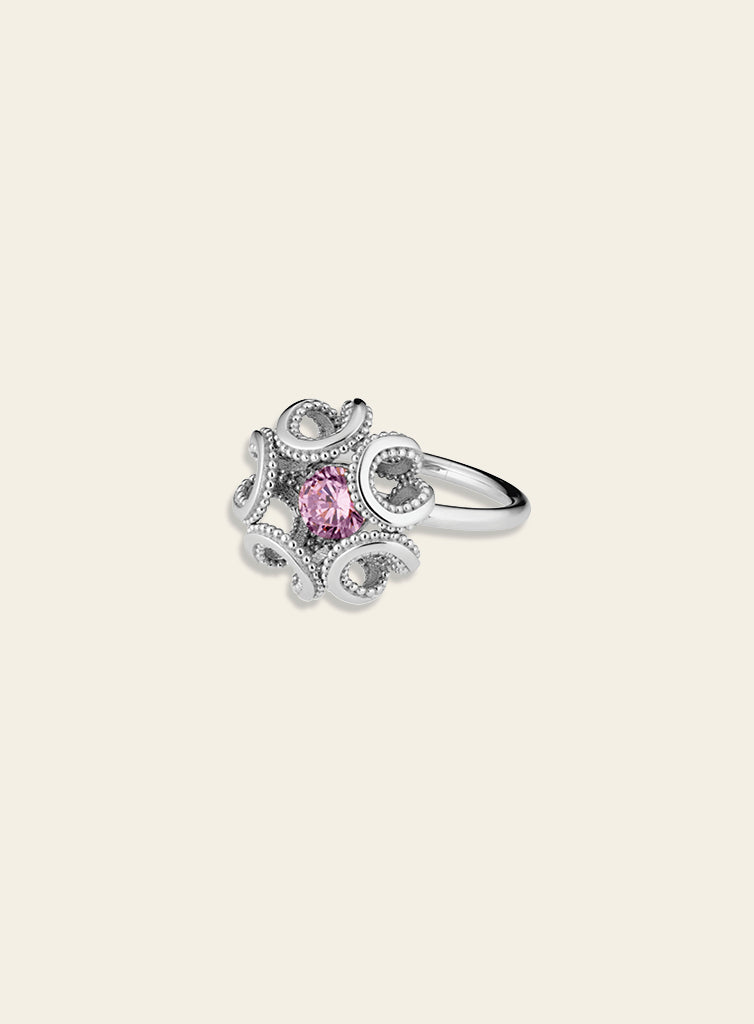 Alma yhdistää viktoriaanisen koristeellisuuden ja modernin muotoilun pitsimäisillä yksityiskohdilla. Sormuksen keskelle asetettu vaaleanpunainen kivi korostaa korun kerroksellisuutta. Alma on moderni perintökoru – näyttävä mutta ajaton valinta sekä juhlaan että arkeen. Saatavilla myös keltakullattuna. Sormuksesta on saatavilla koot 15,5 - 21 ja korun koko on 33x30mm.